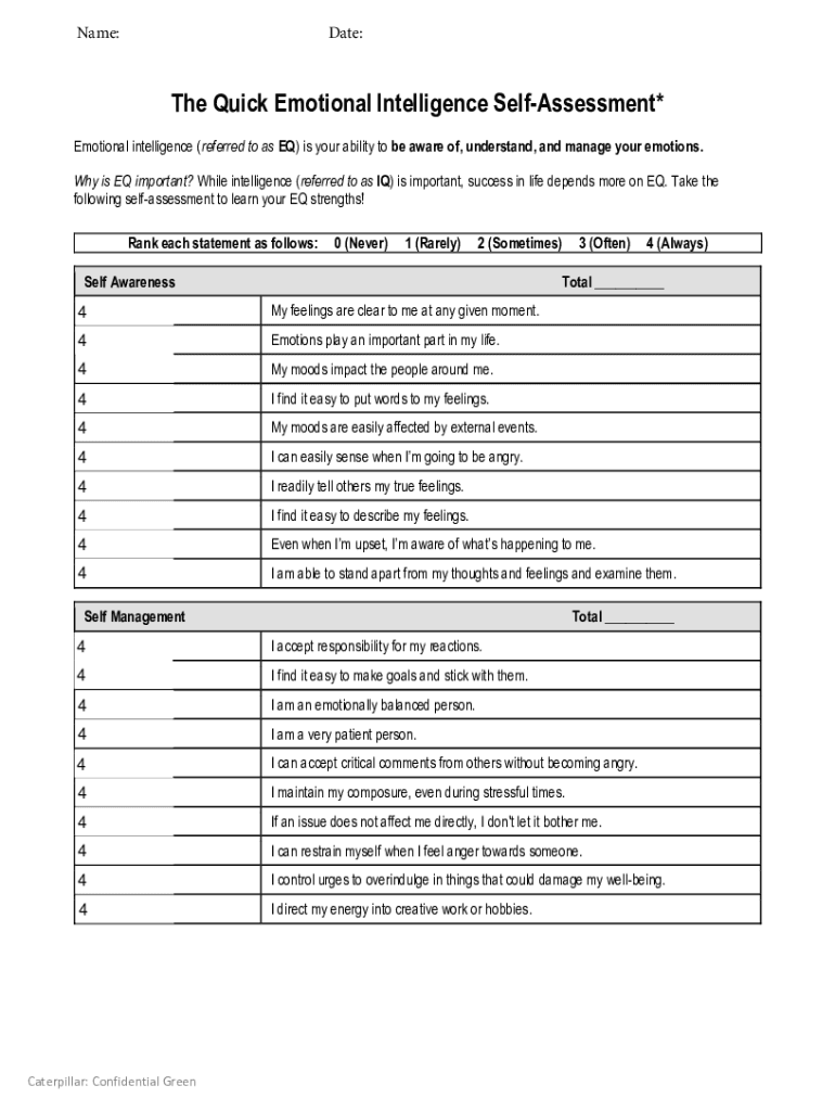 Name:Date:The Quick Emotional Intelligence Reassessment* Emotional intelligence (referred to as EQ) is your ability to be aware of, understand, and manage your emotions. Why is EQ important? While