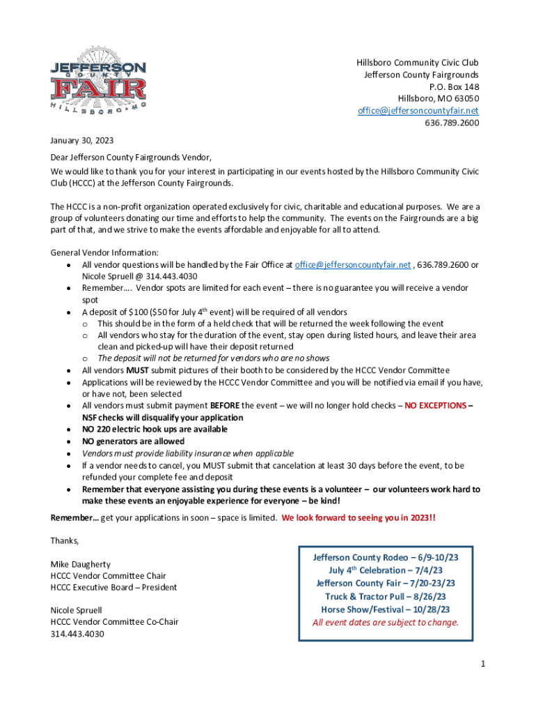 Hillsboro Community Civic Club Jefferson County Fairgrounds P.O. Box 148 Hillsboro, MO 63050 office@jeffersoncountyfair.net 636.789.2600 January 30, 2023, Dear Jefferson County Fairgrounds Vendor,