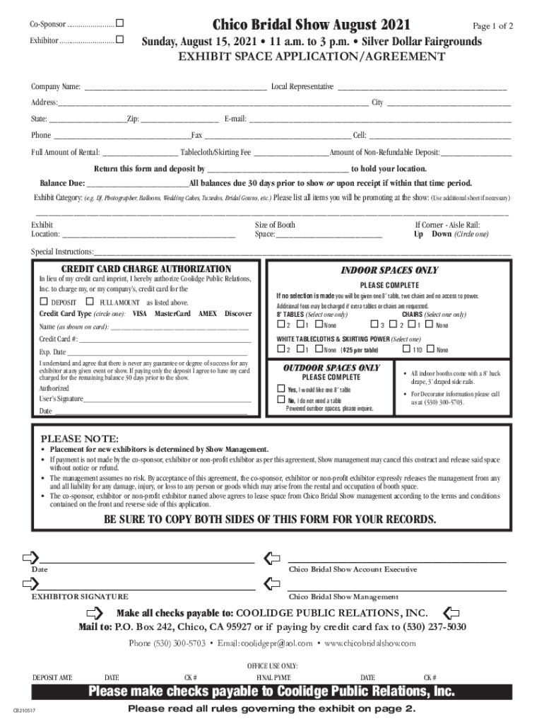 Chico Bridal Show August 2021CoSponsor ........................ Exhibitor............................ Page 1 of 2Sunday, August 15, 2021 11 a.m. to 3 p.m. Silver Dollar Fairgrounds EXHIBIT SPACE APPLICATION/AGREEMENTCompany