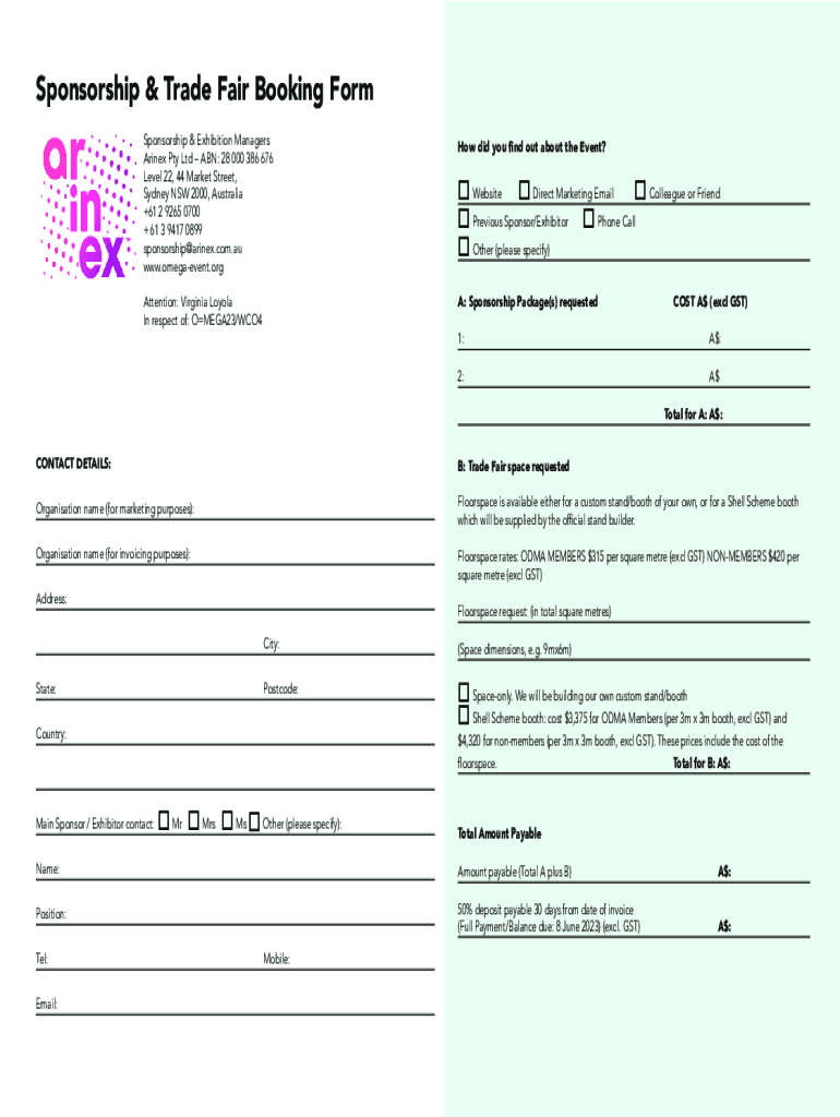 Sponsorship & Trade Fair Booking Form Sponsorship & Exhibition Managers Marine Pty Ltd ABN: 28 000 386 676 Level 22, 44 Market Street, Sydney NSW 2000, Australia +61 2 9265 0700 + 61 3 9417 0899 sponsorship@arinex.com.au