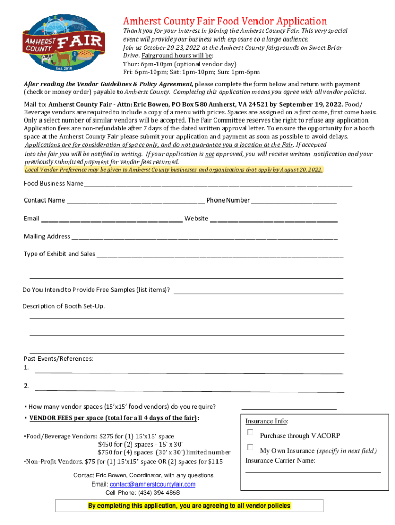 Amherst County Fair Food Vendor ApplicationThank you for your interest in joining the Amherst County Fair. This very special event will provide your business with exposure to a large audience. Join