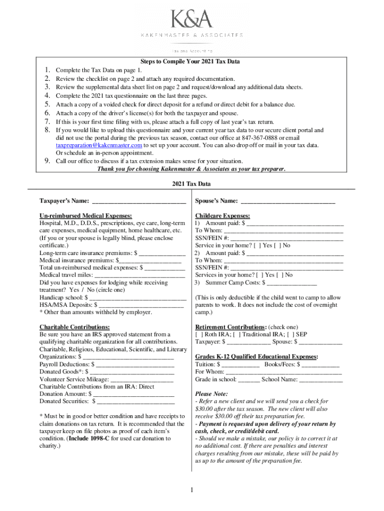 1. 2. 3. 4. 5. 6. 7. 8.9. Steps to Compile Your 2021 Tax Data Complete the Tax Data on page 1. Review the checklist on page 2 and attach any required documentation. Review the supplemental data sheet