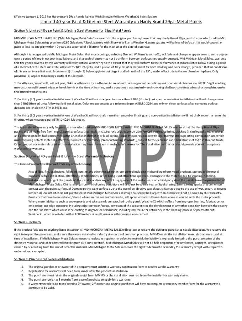 Effective January 1, 2019, For Hardy Brand 29ga Panels Painted With Sherwin Williams Weather XL Paint SystemLimited 40year Paint & Lifetime Steel Warranty on Hardy Brand 29ga. Metal Panels Section