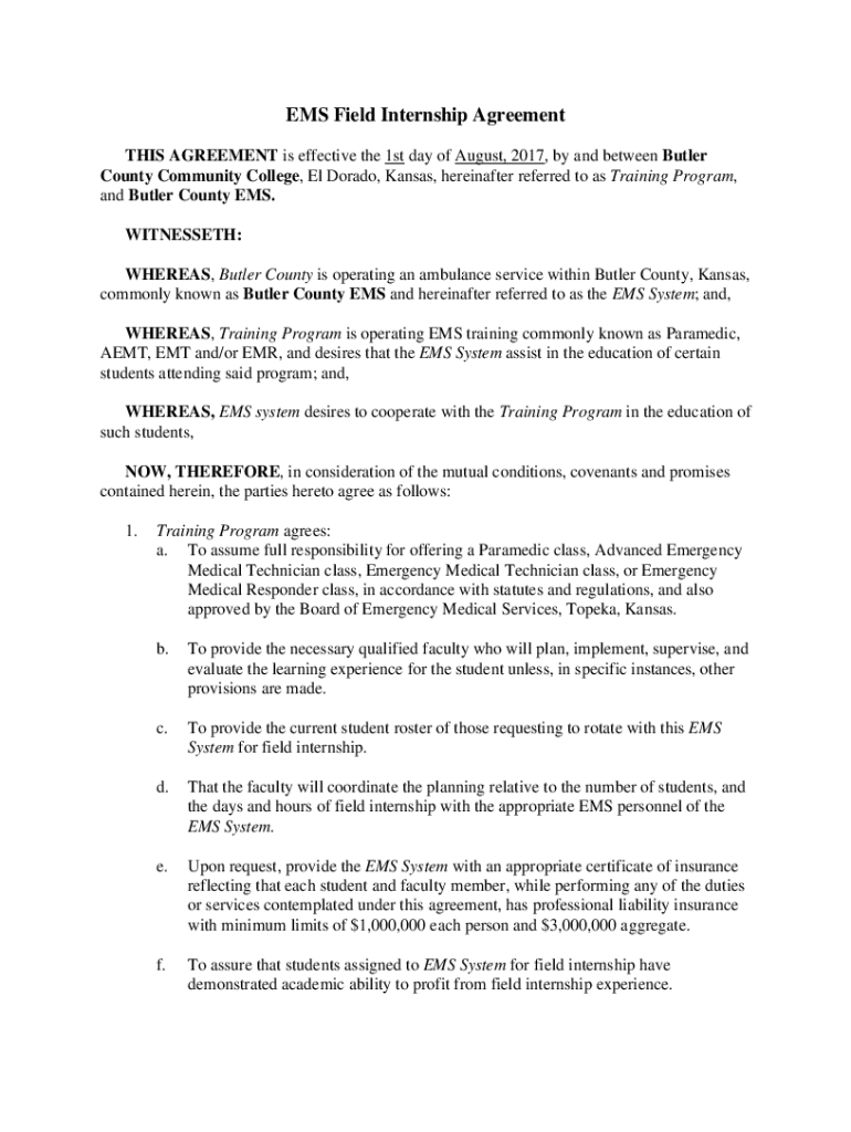 EMS Field Internship Agreement THIS AGREEMENT is effective the 1st day of August 2017, by and between Butler County Community College, El Dorado, Kansas, hereinafter referred to as Training Program,