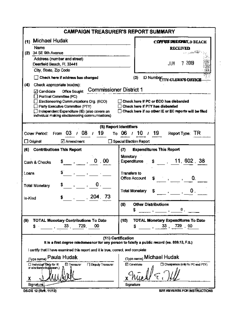 CAMPAIGN TREASURER\'S REPORT SUMMARY