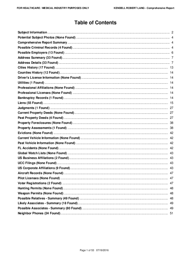 FOR HEALTHCARE / MEDICAL INDUSTRY PURPOSES ONLYKENDELL ROBERT LANG Comprehensive Reportable of Contents Subject Information .............................................................................................................................................