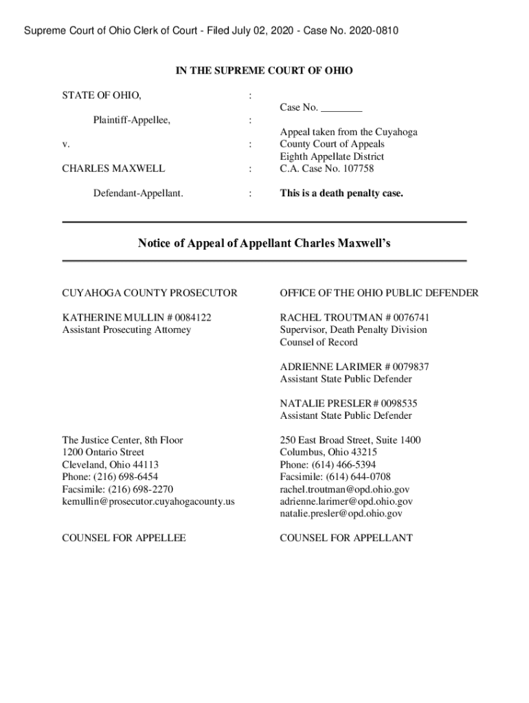 Supreme Court of Ohio Clerk of Court Filed July 02, 2020, Case No. 20200810IN THE SUPREME COURT OF OHIO STATE OF OHIO, : Case No. ___PlaintiffAppellee, :v.:CHARLES MAXWELL:Appeal taken from the Cuyahoga