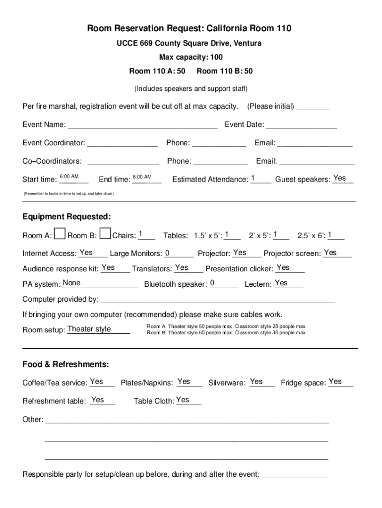 Room Reservation Request: California Room 110 CCE 669 County Square Drive, Ventura Max capacity: 100 Room 110 A: 50Room 110 B: 50(Includes speakers and support staff)Per fire marshal, registration