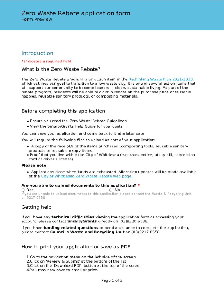 Zero Waste Rebate application form PreviewIntroduction * indicates a required what is the Zero Waste Rebate? The Zero Waste Rebate program is an action item in the Rethinking Waste Plan 20212030,