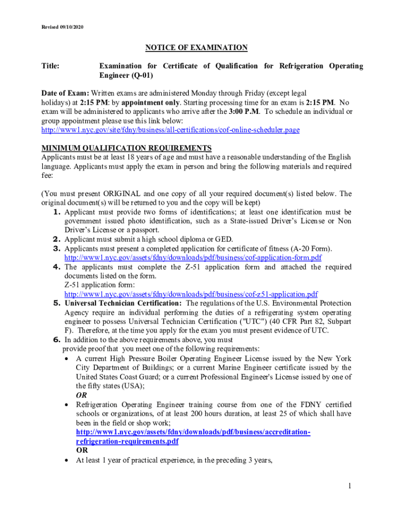Revised 09/10/2020NOTICE OF EXAMINATION Title:Examination for Certificate of Qualification for Refrigeration Operating Engineer (Q01)Date of Exam: Written exams are administered Monday through Friday