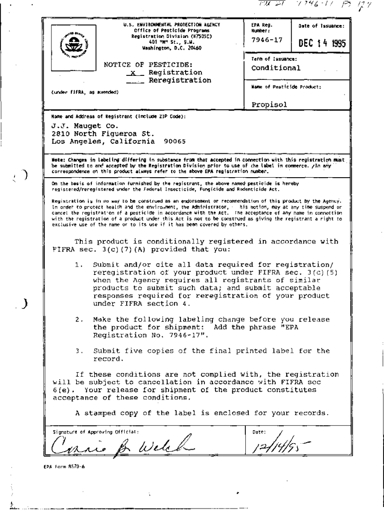 \”/7\'1(, //u.s. ENVIRONMENTAL PROTECTION AGENCY Office of pesticide Programs Restoration Division (H7505C) 401 \” MID St., Saw. Washington, O.C. 20460fEPA Reg. Climber:Date of Issuance:794617DEC