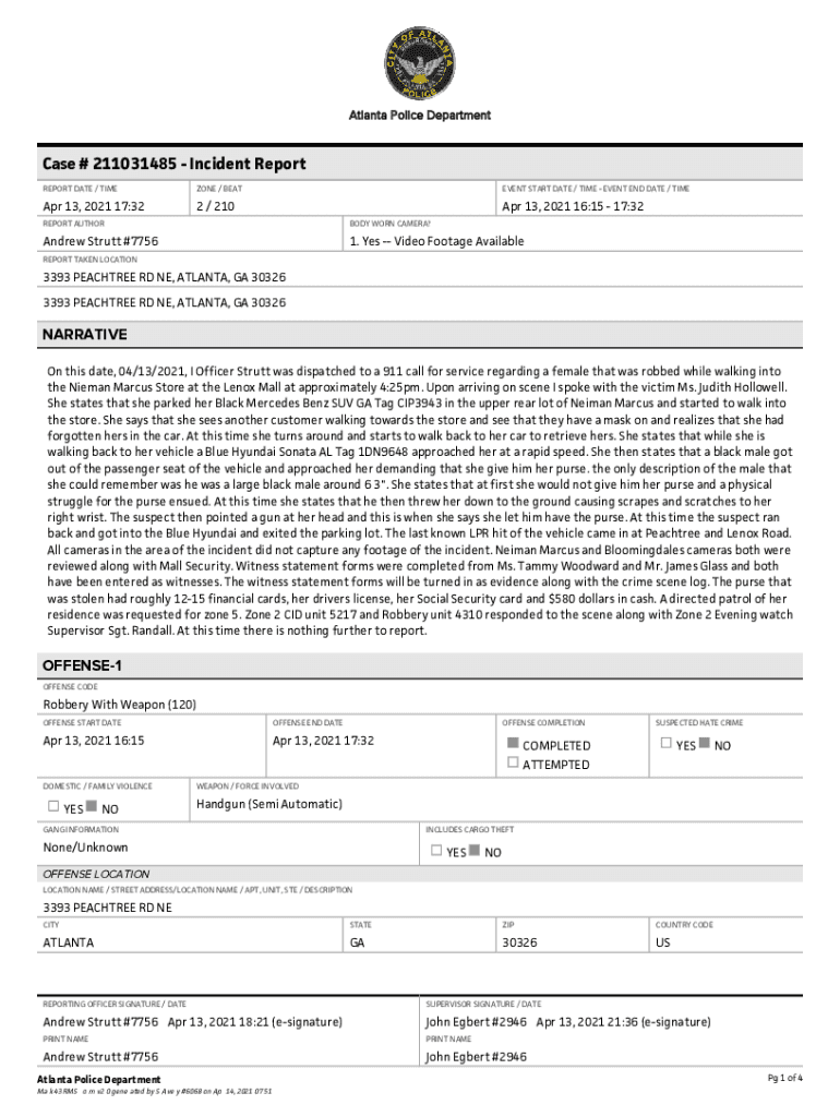 Atlanta Police Department Case # 211031485 Incident Report DATE / TIMEZONE / BEAT Apr 13, 2021 17:322 / 210EVENT START DATE / TIME EVENT END DATE / TIME Apr 13, 2021 16:15 17:32REPORT AUTHORITY WORN