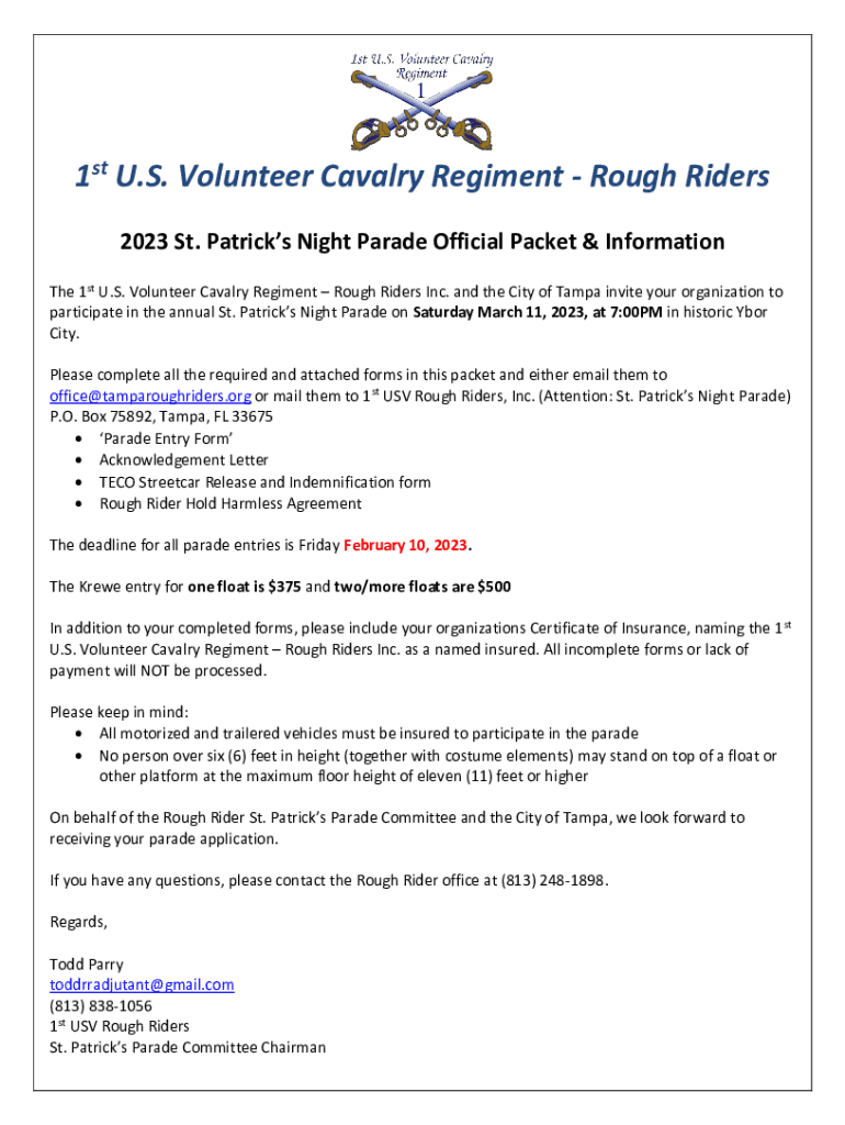 1st U.S. Volunteer Cavalry Regiment Rough Riders 2023 St. Patrick's Night Parade Official Packet & Information The 1st U.S. Volunteer Cavalry Regiment Rough Riders Inc. and the City of Tampa invite
