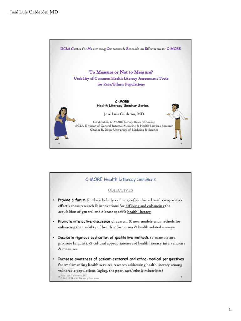 Jo's Luis Calder, MD UCLA Center for Maximizing Outcomes & Research on Effectiveness Moreno Measure or Not to Measure? Usability of Common Health Literacy Assessment Tools for Race/Ethnic PopulationsCMORE