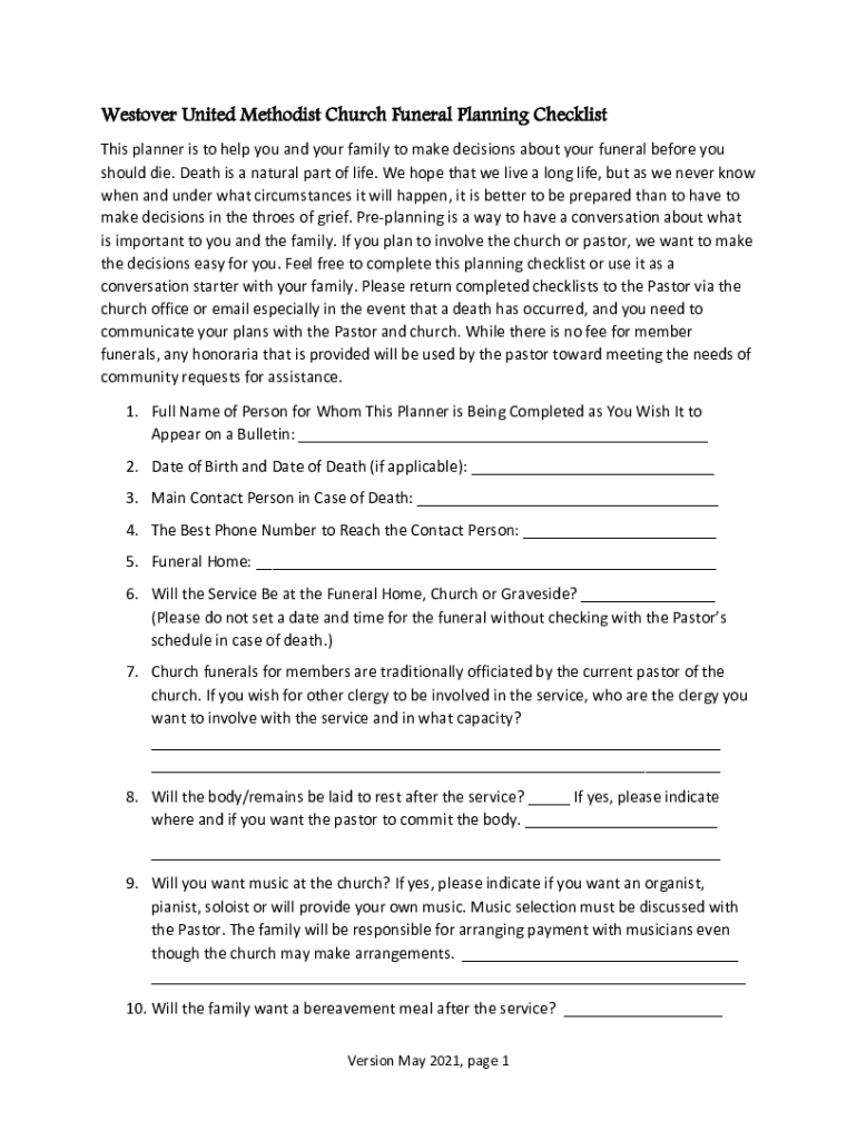Get the free Westover United Methodist Church Funeral Planning Checklist