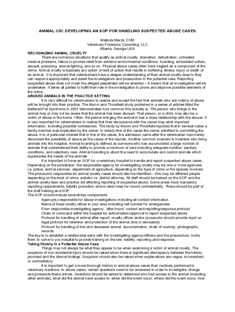 ANIMAL CSI: DEVELOPING AN SOP FOR HANDLING SUSPECTED ABUSE CASES Melinda Merck, DVM Veterinary Forensics Consulting, LLC Atlanta, Georgia USA RECOGNIZING ANIMAL CRUELTY There are numerous situations
