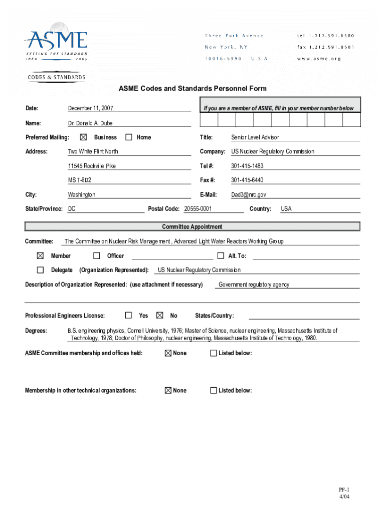 Get the free ASME PAF-A, Donald Dube ASME Codes and Standards ...