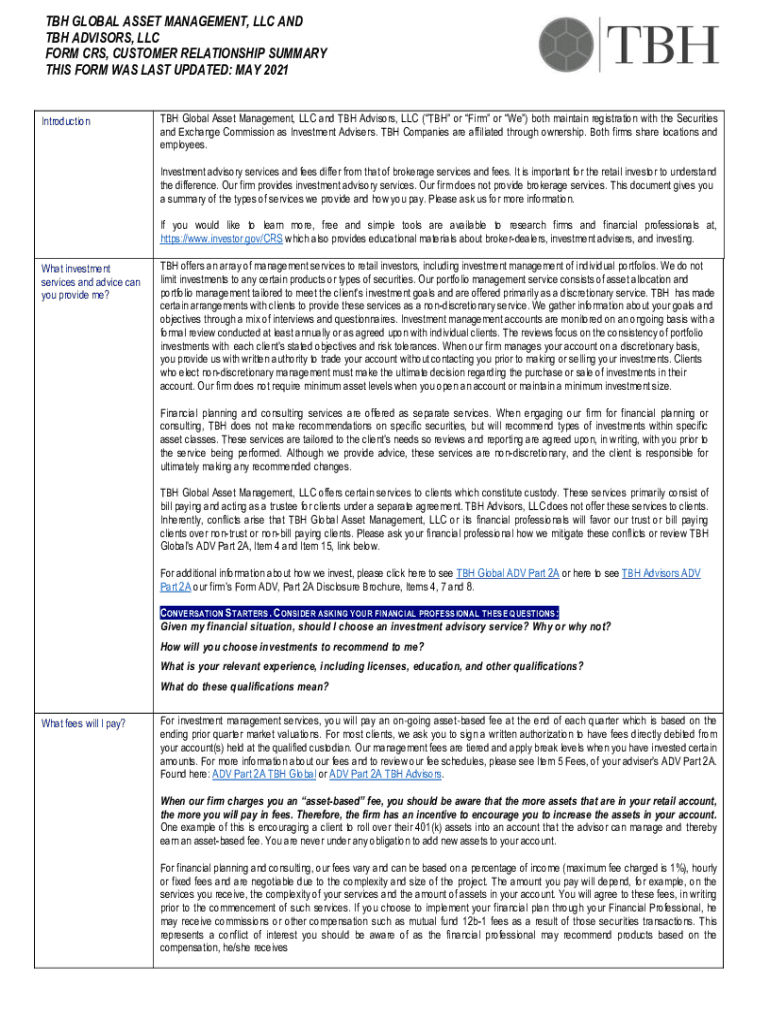 TBH GLOBAL ASSET MANAGEMENT, LLC AND TBH ADVISORS, LLC FORM CRS, CUSTOMER RELATIONSHIP SUMMARY THIS FORM WAS LAST UPDATED: MAY 2021 Introduction TBH Global Asset Management, LLC and TBH Advisors,