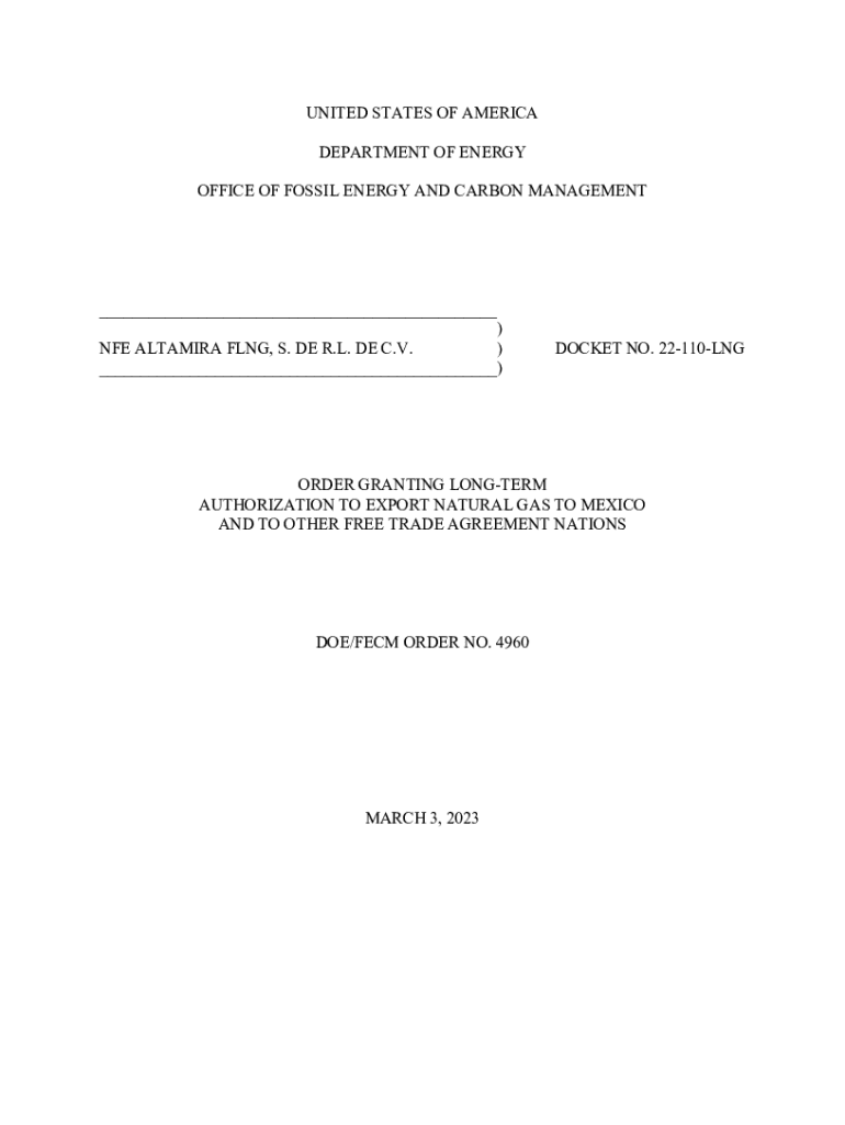 UNITED STATES OF AMERICA DEPARTMENT OF ENERGY OFFICE OF FOSSIL ENERGY AND CARBON MANAGEMENT___) NFL ALTAMIRA FLAG, S. DE R.L. DE C.V.) ___)DOCKET NO. 22110LNGORDER GRANTING LONGER AUTHORIZATION TO