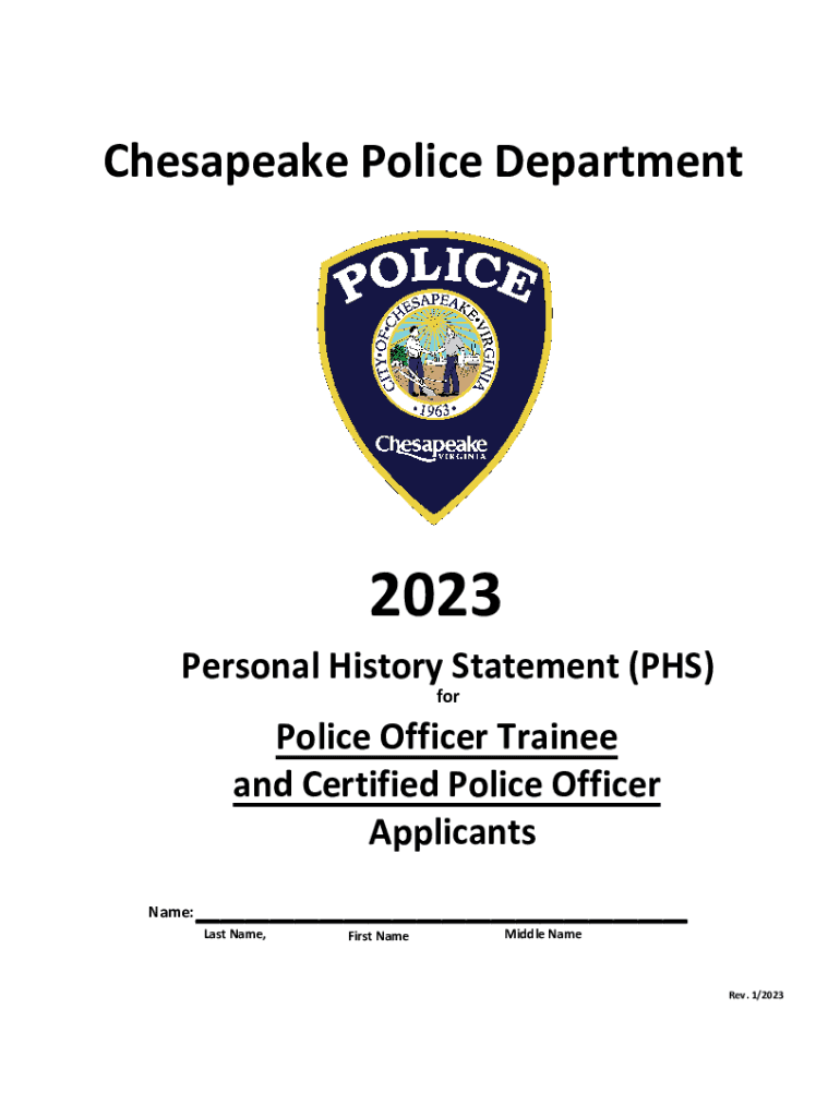 Chesapeake Police Department2023Personal History Statement (PHS) police Officer Trainee and Certified Police Officer Applicants Name:___ Last Name, First NameMiddle Name Rev. 1/2023INSTRUCTIONS ON
