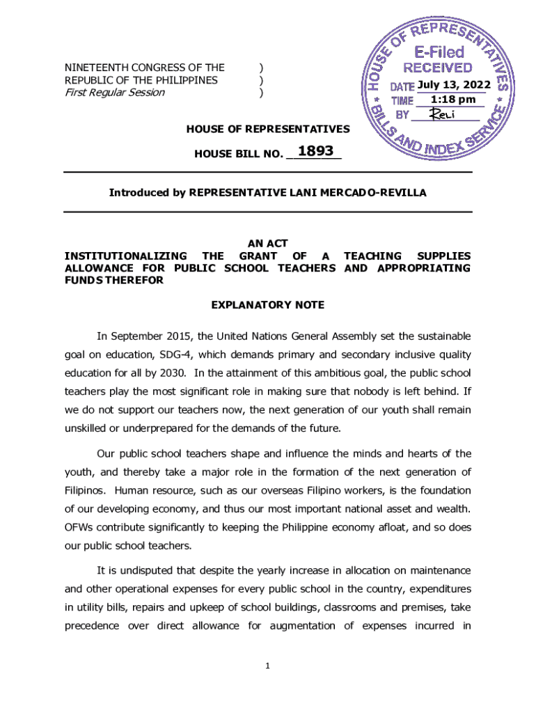 NINETEENTH CONGRESS OF THE REPUBLIC OF THE PHILIPPINESFirst Regular Session)))July 13, 2022 1:18 house OF REPRESENTATIVES1893 HOUSE BILL NO. ___ Introduced by REPRESENTATIVE LAND MERCADOREVILLAAN