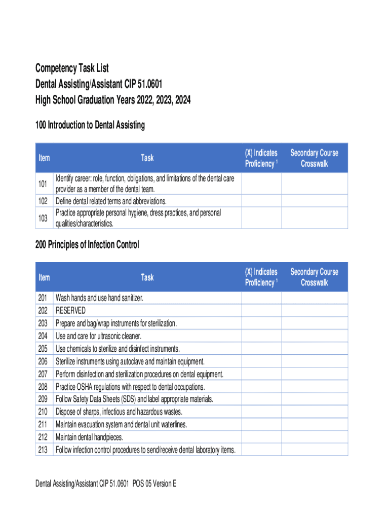 Competency Task List Dental Assisting/Assistant CIP 51.0601 High School Graduation Years 2022, 2023, 2024 100 Introduction to Dental Assisting Item 101 102 103Task(X) Indicates Proficiency 1Secondary