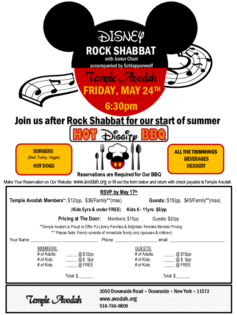 ROCK SHABBAT with Junior Choir accompanied by SchleppenwolfTemple AvodahFRIDAY, MAY 24TH 6:30pm Join us after Rock Shabbat for our start of summer BURGERS ALL THE TRIMMINGS BEVERAGES DESSERT(Beef,