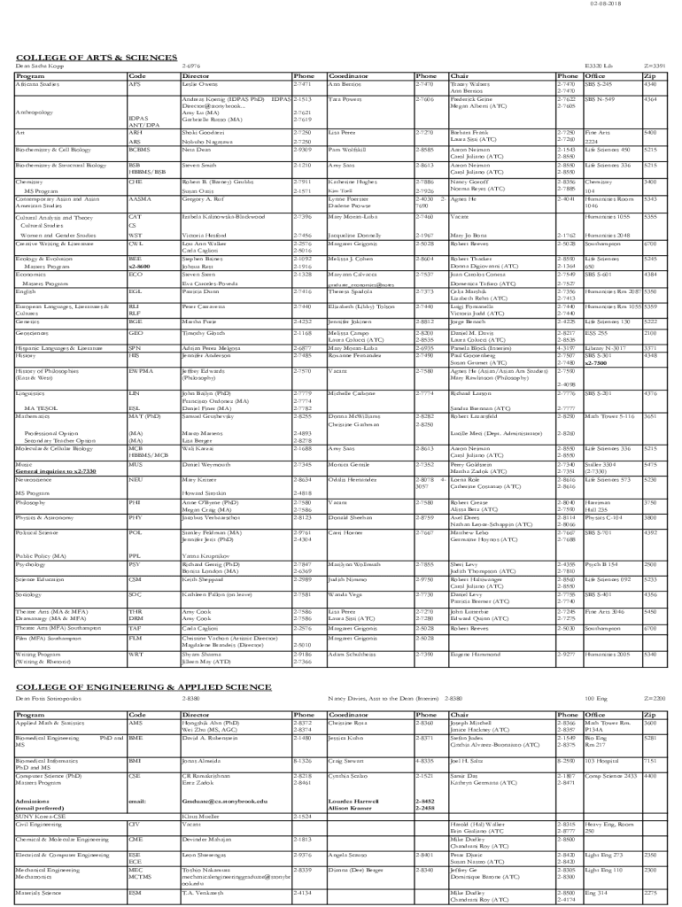 02082018COLLEGE OF ARTS & SCIENCES Dean Sacha Kopp26976E3320 LibZ3391ProgramCodeDirectorPhoneCoordinatorPhoneChairPhone OfficeZipAfricana StudiesAFSLeslie Owens27471Ann Berrios27470Tracey Walters