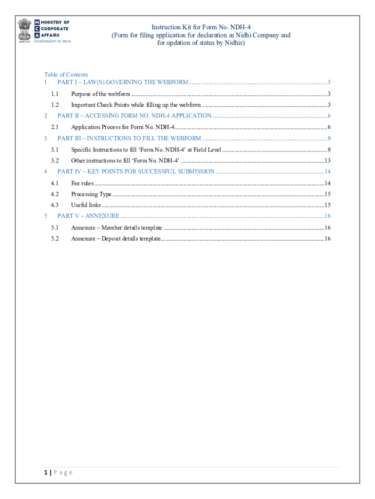 Instruction Kit for Form No. NDH4 (Form for filing application for declaration as Night Company and for update of status by Nights)Table of Contents 1 PART I LAW(S) GOVERNING To PERFORM..........................................................................................