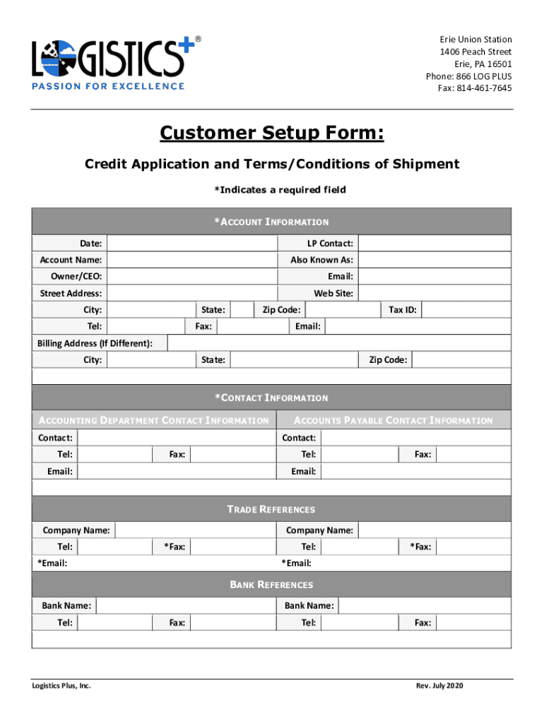 Businesses or individuals looking to establish a credit account for services with Logistics Plus are required to file the Logistics Plus Customer Setup Form Credit Application.