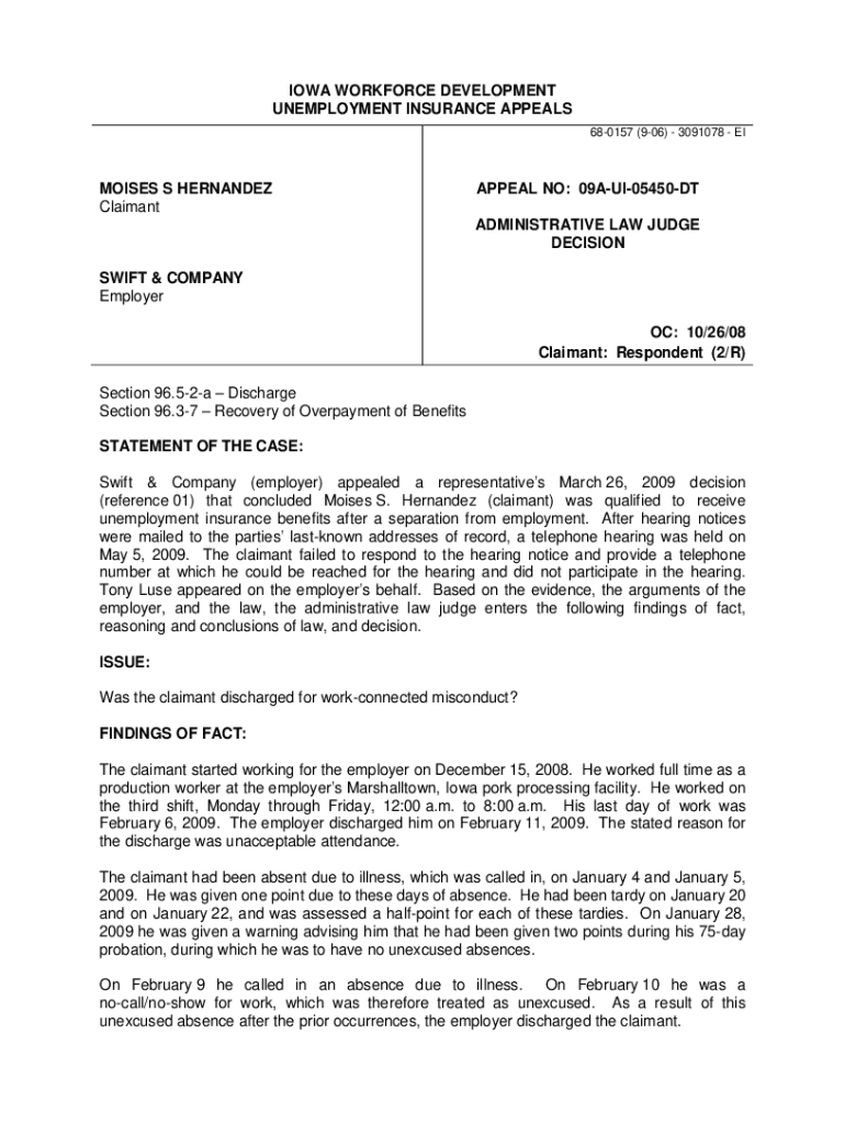 IOWA WORKFORCE DEVELOPMENT UNEMPLOYMENT INSURANCE APPEALS 680157 (906) 3091078 MOISES S HERNANDEZ ClaimantAPPEAL NO: 09AUI05450DT ADMINISTRATIVE LAW JUDGE DECISION SWIFT & COMPANY Employer OC: 10/26/08