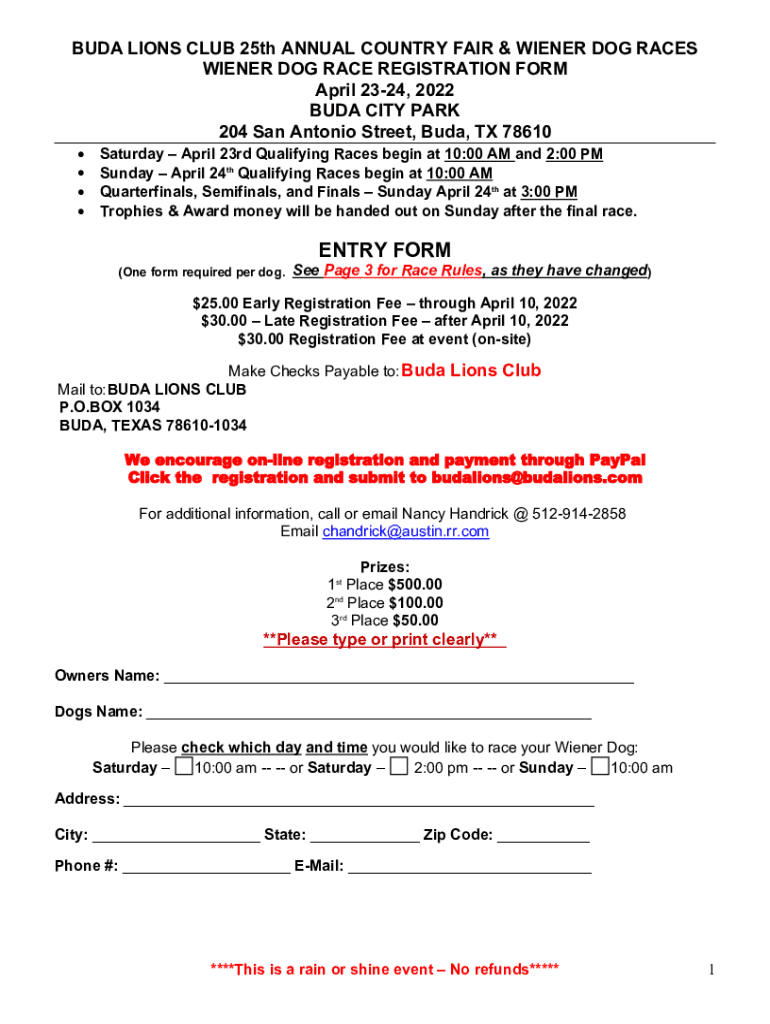 BUD LIONS CLUB 25th ANNUAL COUNTRY FAIR & WIENER DOG RACES WIENER DOG RACE REGISTRATION FORM April 2324, 2022 BUD CITY PARK 204 San Antonio Street, Bud, TX 78610 Saturday, April 23rd Qualifying Races