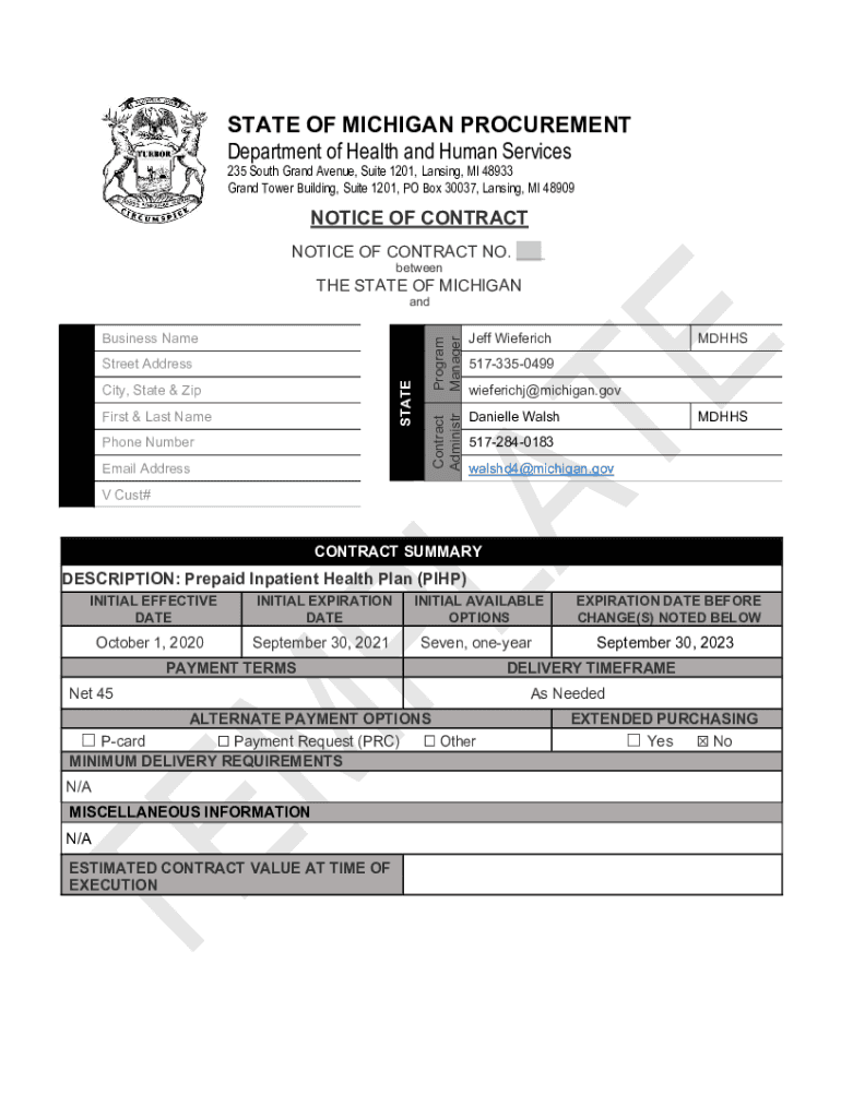 STATE OF MICHIGAN PROCUREMENT Department of Health and Human Services 235 South Grand Avenue, Suite 1201, Lansing, MI 48933 Grand Tower Building, Suite 1201, PO Box 30037, Lansing, MI 48909NOTICE