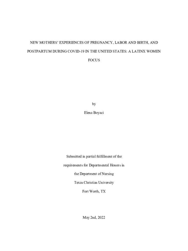 NEW MOTHERS EXPERIENCES OF PREGNANCY, LABOR AND BIRTH, AND POSTPARTUM DURING COVID-19 IN THE UNITED STATES: A LATINX WOMEN FOCUS by Elena BoyaciSubmitted in partial fulfillment of the requirements