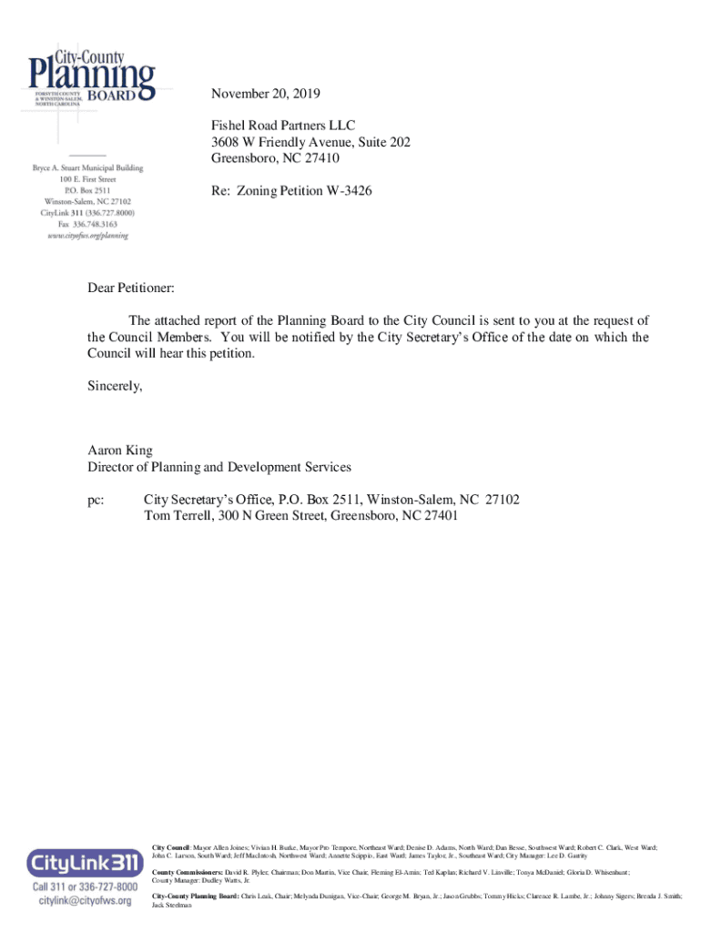 November 20, 2019, Fisher Road Partners LLC 3608 W Friendly Avenue, Suite 202 Greensboro, NC 27410 Re: Zoning Petition W3426Dear Petitioner: The attached report of the Planning Board to the City Council