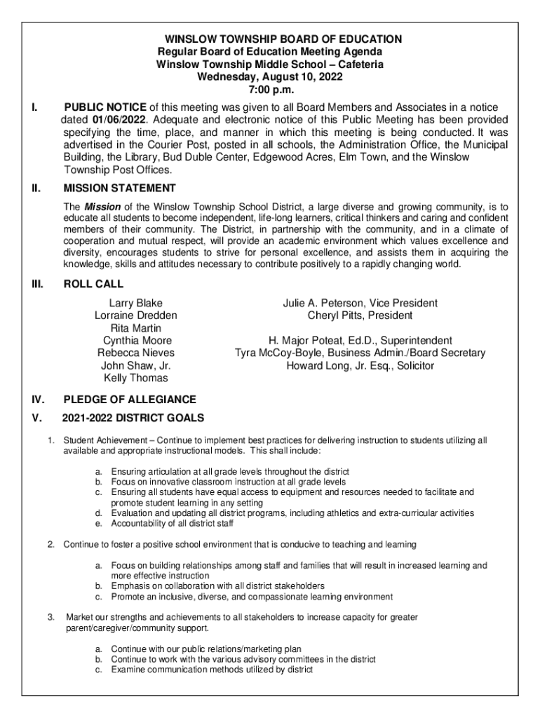 WINSLOW TOWNSHIP BOARD OF EDUCATION Regular Board of Education Meeting Agenda Winslow Township Middle School Cafeteria Wednesday, August 10, 2022 7:00 p.m. I.PUBLIC NOTICE of this meeting was given