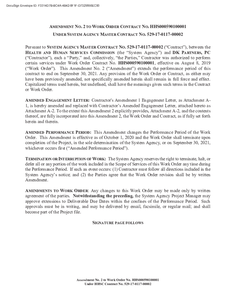 AMENDMENT NO. 2 TO WORK ORDER CONTRACT NO. HHS000590100001 UNDER SYSTEM AGENCY MASTER CONTRACT NO. 52917011700002 Pursuant to SYSTEM AGENCY MASTER CONTRACT NO. 52917011700002 (Contract), between the