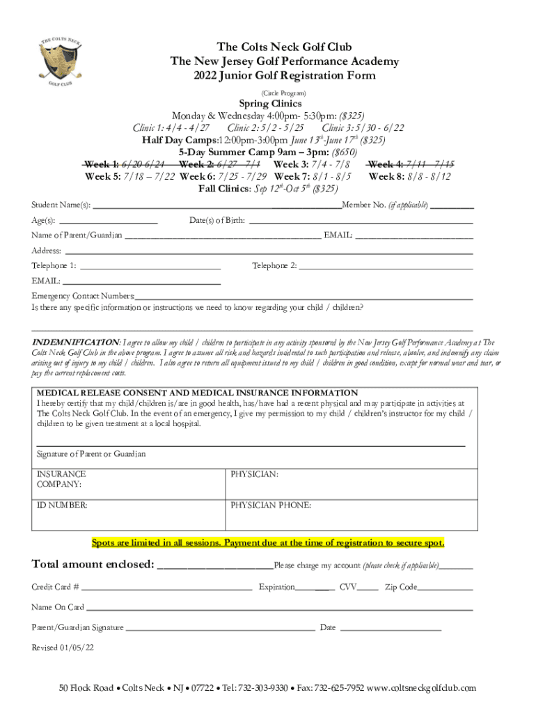 The Colts Neck Golf Club The New Jersey Golf Performance Academy 2022 Junior Golf Registration Form (Circle Program)Spring Clinics Monday & Wednesday 4:00pm 5:30pm: ($325) Clinic 1: 4/4 4/27 Clinic