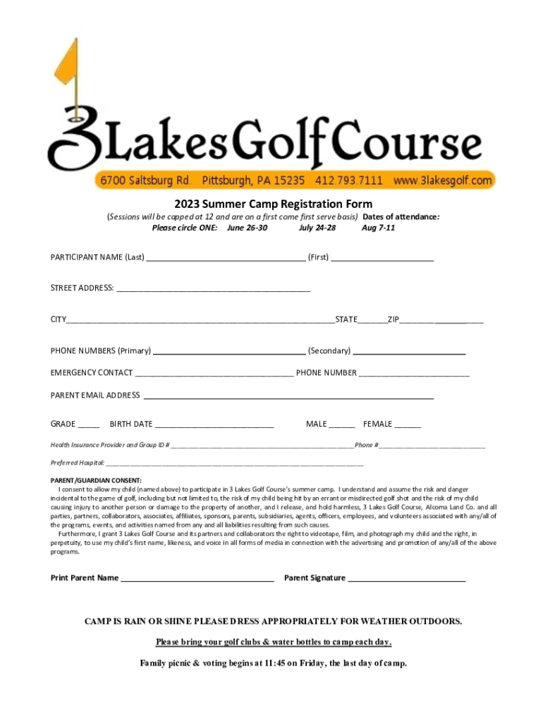 2023 Summer Camp Registration Form (Sessions will be capped at 12 and are on a first come, first served basis) Dates of attendance: Please circle ONE: June 2630 July 2428 Aug 711 PARTICIPANT NAME