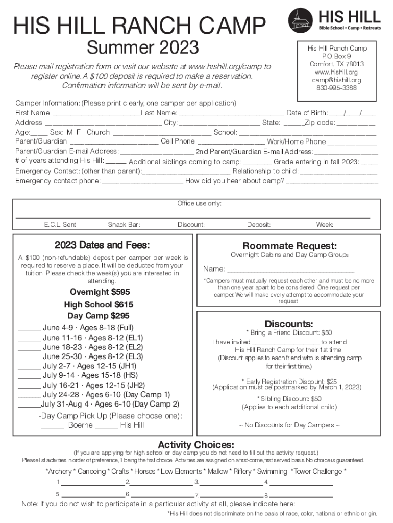 HIS HILL RANCH CAMP Summer 2023Please mail registration form or visit our website at www.hishill.org/camp to register online. A $100 deposit is required to make a reservation. Confirmation information