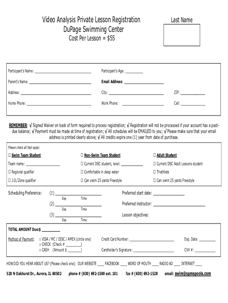 Dupage Swimming Centers Names Per Lesson $55Participants Name:Participants Age:Parents Name:Email Address:Address:City:ZIP:Home Phone:Work Phone:Cell:_REMEMBER: