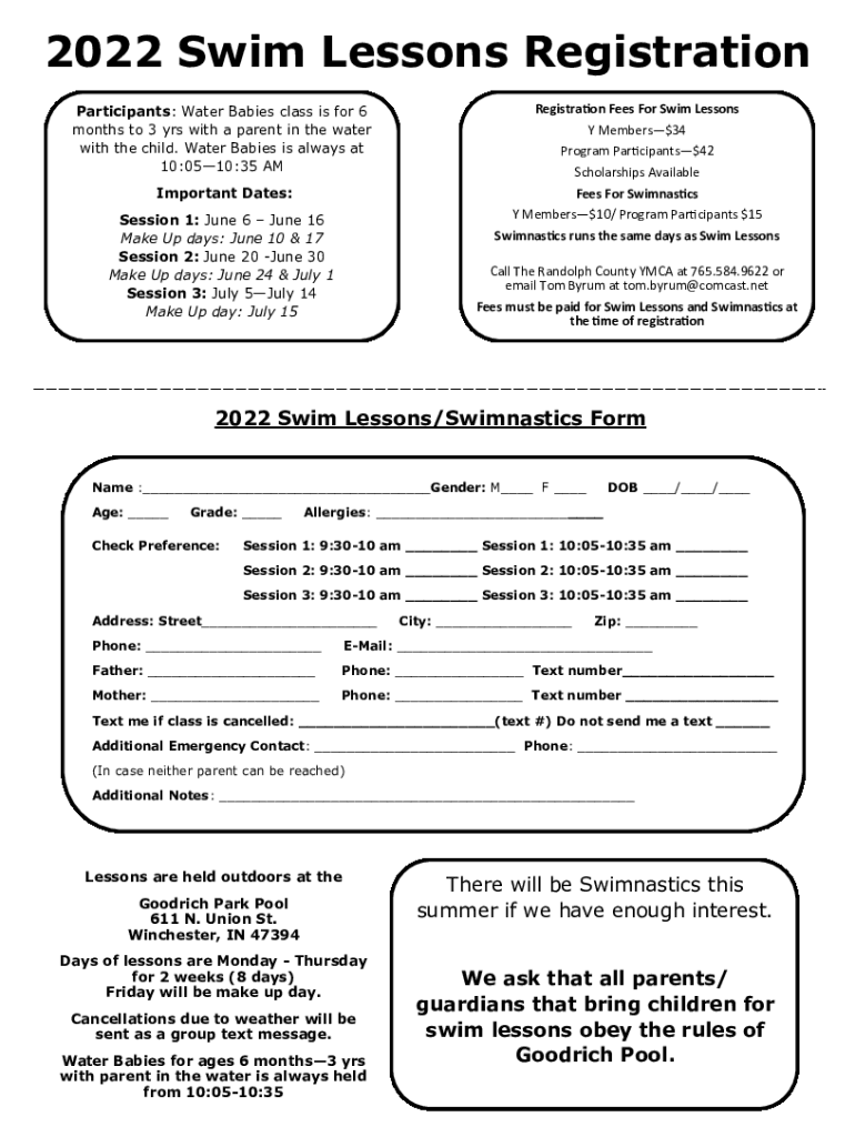 2022 Swim Lessons Registration Participants: Water Babies class is for 6 months to 3 yrs with a parent in the water with the child. Water Babies is always at 10:0510:35 AM Important Dates: Session