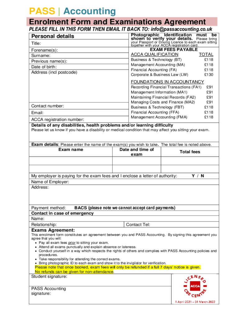 Enrollment Form and Examinations AgreementPLEASE FILL IN THIS FORM THEN EMAIL IT BACK TO: info@passaccounting.co.uk