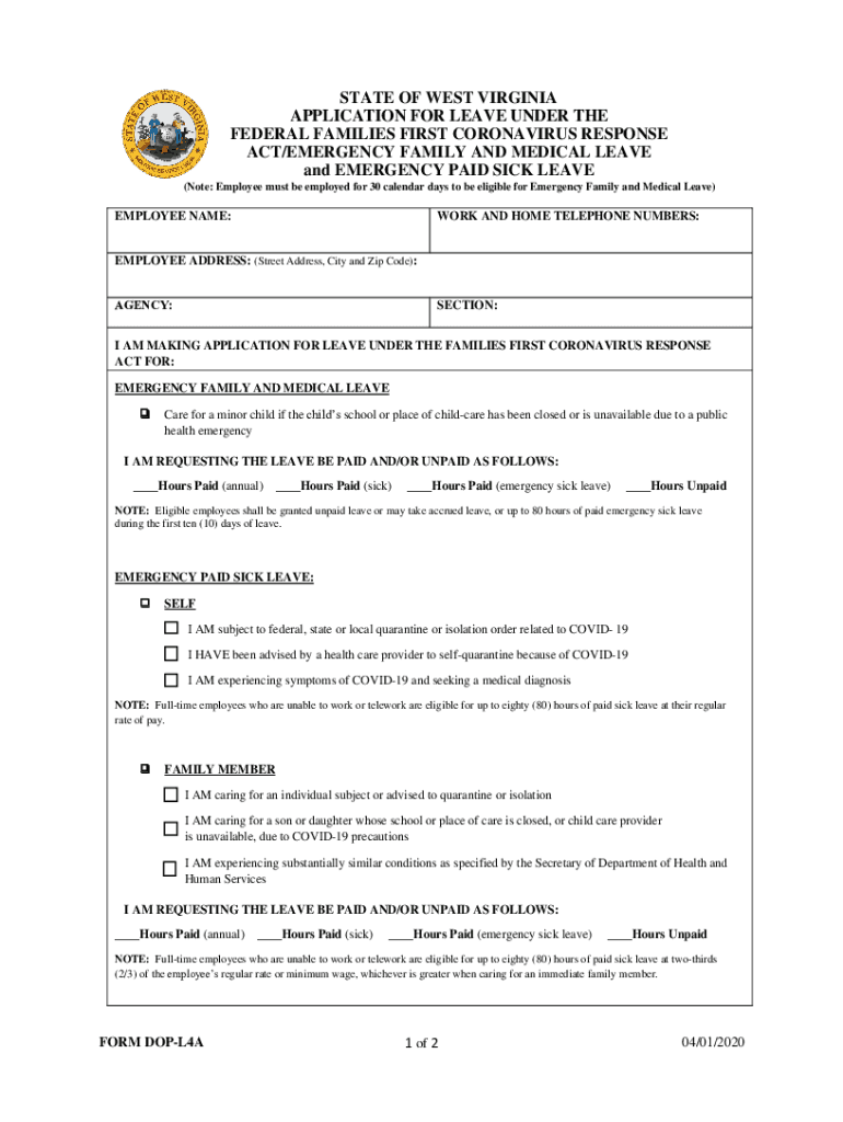 STATE OF WEST VIRGINIA APPLICATION FOR LEAVE UNDER THE FEDERAL FAMILIES FIRST CORONAVIRUS RESPONSE ACT/EMERGENCY FAMILY AND MEDICAL LEAVE and EMERGENCY PAID SICK LEAVE (Note: Employee must be employed