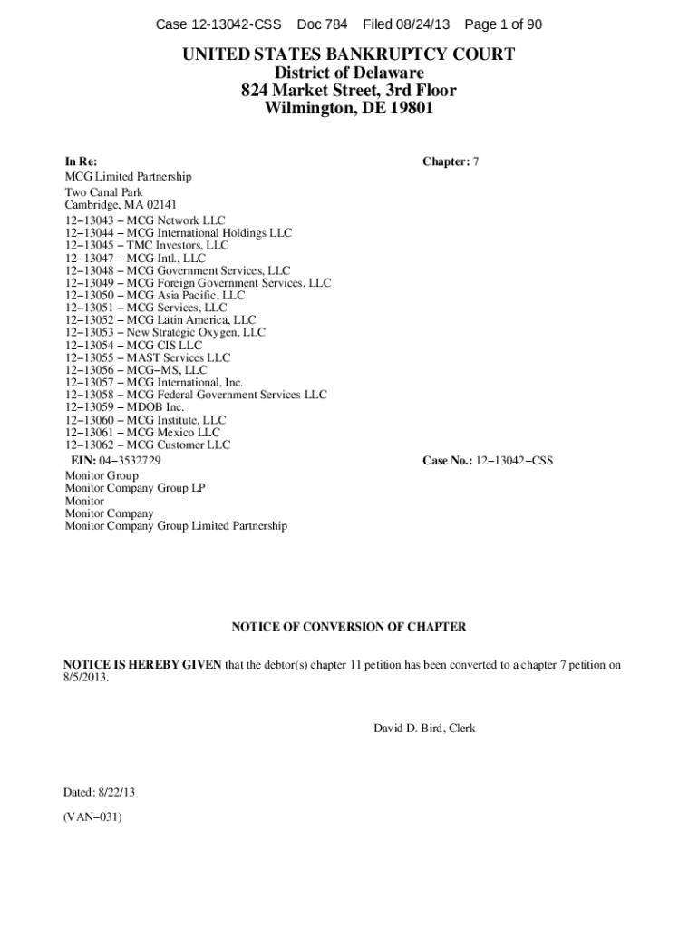 Case 1213042CSSDoc 784Filed 08/24/13Page 1 of 90UNITED STATES BANKRUPTCY COURT District of Delaware 824 Market Street, 3rd Floor Wilmington, DE 19801 In Re: MCG Limited Partnership Two Canal Park