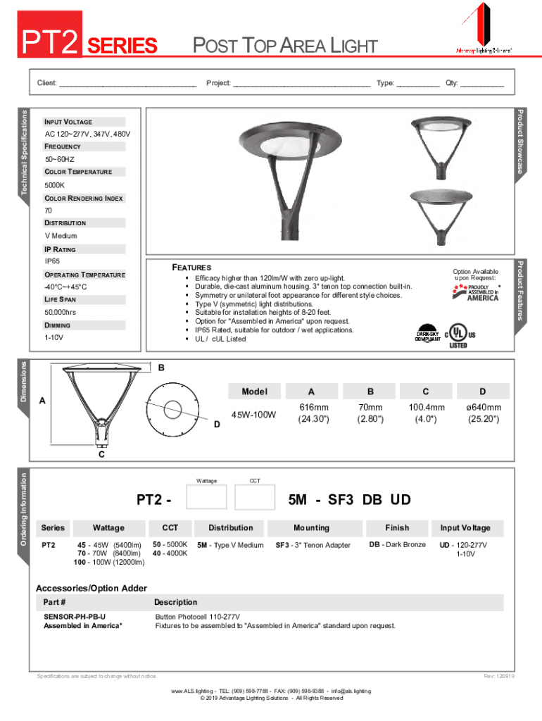 PT2 SERIES POST TOP AREA LIGHT Project: ___ Type: ___ Qty: ___Product ShowcaseTechnical SpecificationsClient: ___INPUT VOLTAGE AC 120277V, 347V, 480V FREQUENCY 5060HZ COLOR TEMPERATURE 5000K COLOR