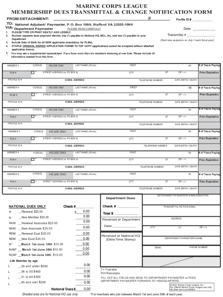 MARINE CORPS LEAGUE MEMBERSHIP DUES TRANSMITTAL & CHANGE NOTIFICATION FORM #FROM:DETACHMENT: TO: National Adjutant/ Paymaster, P.O. Box 1990, Stafford VA 225551990 VIA: Department Paymaster PLEASE