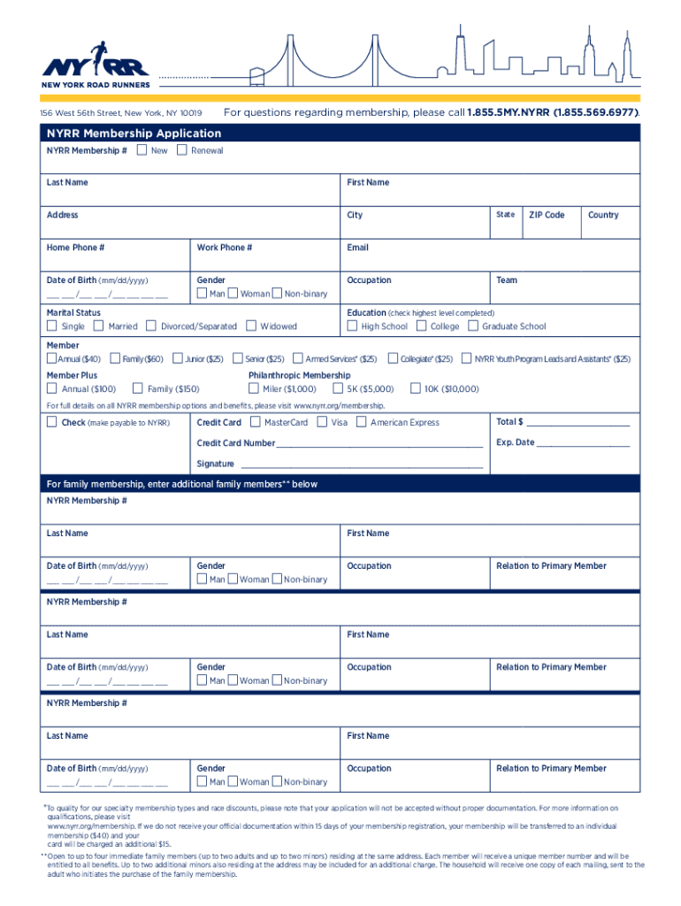 156 West 56th Street, New York, NY 10019For questions regarding membership, please call 1.855.5MY.NY RR (1.855.569.6977).HELP AND INSPIRE PEOPLE THROUGH RUNNINGNYRR Membership Application156