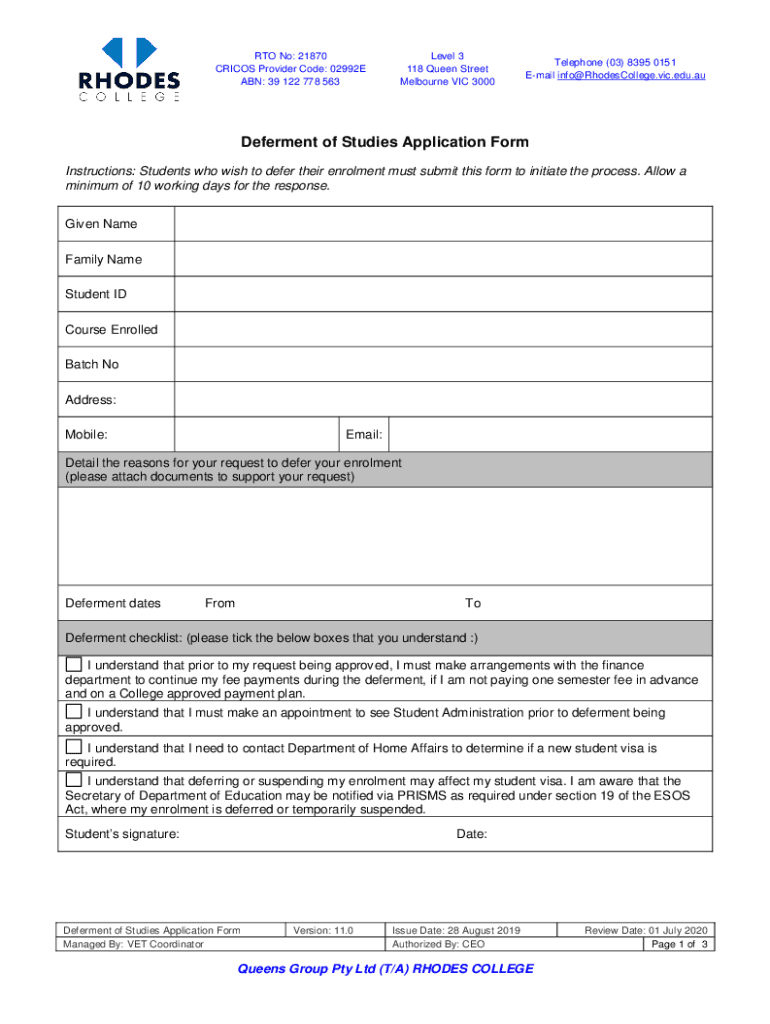 Get the free Deferment of Studies Application Form v11.0.docx