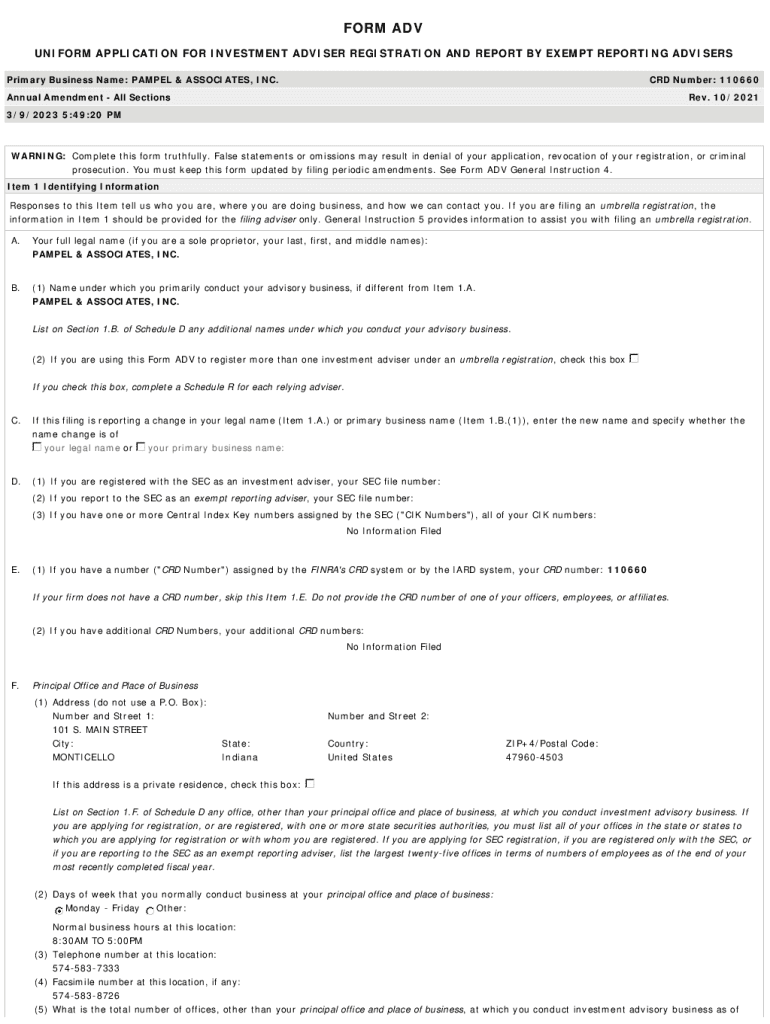 FORM ADV UNIFORM APPLICATION FOR INVESTMENT ADVISER REGISTRATION AND REPORT BY EXEMPT REPORTING ADVISERS Primary Business Name: PAMPER & ASSOCIATES, INC.CRD Number: 110660Annual Amendment All Sections